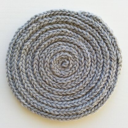 Round coasters measuring 11cm in diameter. They are made by knitting a long i-cord then rolling it into a spiral. The pattern can be easily altered to make smaller or larger mats or placemats.