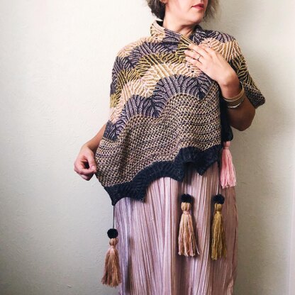 She only loved the espresso at the Grand Hotel, and frequently spent her evenings there, drinking coffee in her favorite cocktail dress :: An elegant rectangular stole with chevron stripes, tweedy texture, and pom tassels, inspired by early 20th century fashion. All knit using a combination of one-color, two-color, and three-color brioche.