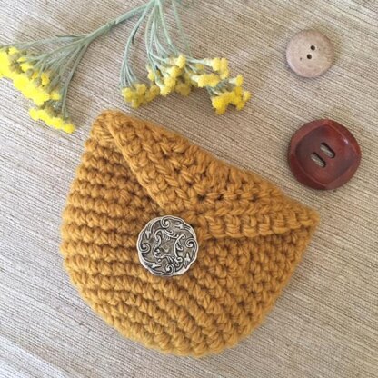 A simple little crocheted purse made in one piece– starting from the bottom up, in a spiral. The flap is then worked flat without breaking off the yarn and includes a button loop.