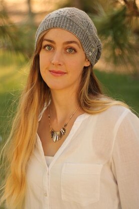 Inspired by the beautiful aspen trees that line the banks of a stunning Northern California mountain stream, Cold Creek Hat is knit from the brim up with a slightly slouchy fit. Two functional buttons at the ribbed brim and a crown of leaves on a gently textured background of reverse stockinette stitch adorn the hat.