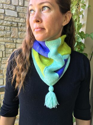 This is the second piece in my Color Block Collection. I created this cowl with Hello Stella Basic Stella Fingering weight yarn. I was inspired by the artistic talents of my son. He uses bright and bold shapes and colors in his art that I thought fit perfectly into this collection. This cowl, like the shawl, is knit piece by piece flat, which makes it easy to work on wherever you are. The separate pieces are seamed together. The cowl is joined together in the back and then a border is added to the bottom. The tassel is optional.