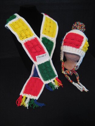 Colorful LEGO blocks make up this cute hat with earflaps, ties and pompom as well as a scarf that has pockets in each end to keep hands warm or hold gloves.