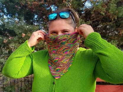 This cowl is made with a modular knitting technique. It is made with twenty seven triangle elements that connect with each other to form scales. You will work with only one triangle element at a time.