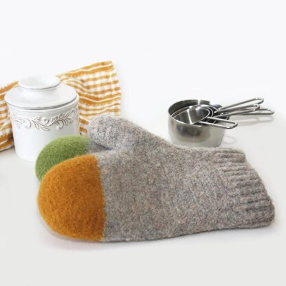 Add a splash of colour to your kitchen with these DIY felted oven mitts. These oven mitts are first crocheted from 100% wool for felting and then felted until they become soft and fuzzy.