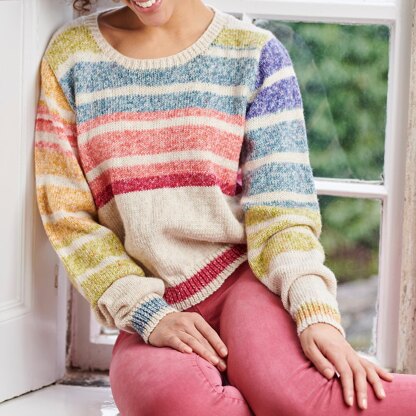 Soft stripes on a cool cream background make this jumper an absolute must-knit this summer.