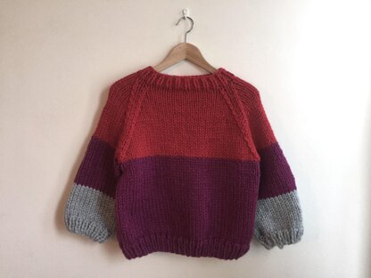 Super easy quick knit suitable for beginners. It is knitted in the round (no seams, yay!), has raglan armholes, bracelet-length baloon-style sleeves and a mock-neck rib neck.