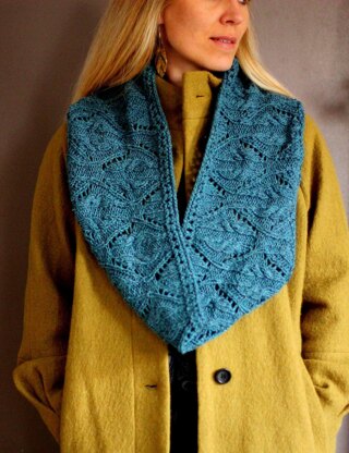 This elegant and feminine cowl/infinity scarf with a beautiful cable and lace pattern is worked in the round. Whether it is worn open or wrapped twice around the neck, this cowl will brighten any outfit.