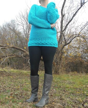 This easy modular sweater pattern starts with an easy to remember cabled bottom worked in rows with the remainder of the pattern worked in half double crochet.