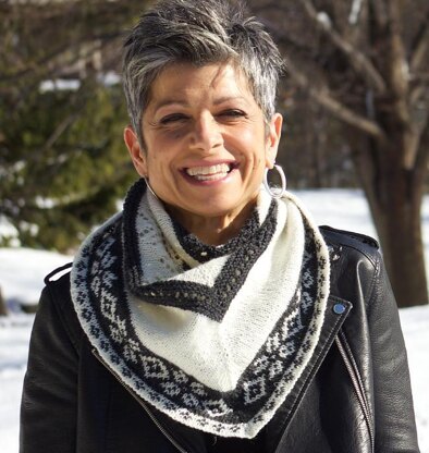 This shawl is a quick knit and includes a few fun techniques to keep your interest. There is a bit of lace, intermittent garter stitch stripes, and a border that can either be done in stranded knitting or double knitting