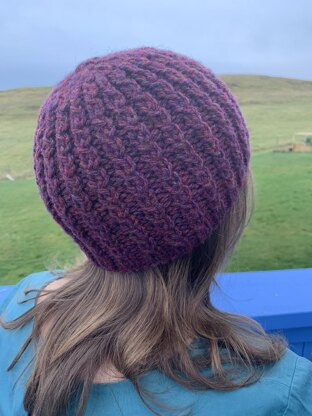 The beanie is knitted entirely in the round in a simple braided rib pattern. The braided ribs connect at the crown to symbolise all the connections I’ve made, old and new coming together.