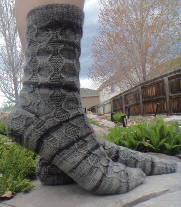 The stitch pattern is formed by lace and slipped stitches; the eyelets are closed up by working them through the back loop to make the socks more “masculine” (grey version). The variegated version (Cool Chick) leaves the eyelets open for a lacy, feminine look.