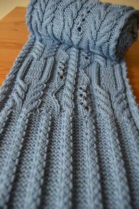 Knit in one piece with675 and 685 yds, DK weight yarn and #6 straight knitting needles. Pattern is in both entirely row by row written and charted instructions. Only other material needed is a cable needle.