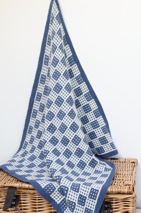 The interesting pattern on this baby blanket is mosaic or slip-stitch knitting. Only one colour is used in any row, the remaining stitches are simply slipped. The basic pattern is garter stitch, so no purling at all, which makes for a thick, warm blanket. The pattern has two options for edges. You can make the blanket as shown with solid borders added after the main blanket has been finished, or if you do not want to pick up stitches, you can knit the borders at the same time which will result in striped borders (not shown). The pattern is both written and charted so you can work from whichever you prefer.