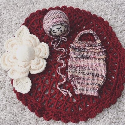 Fits both newborn and 21-22 inch reborn size knit romper set with crochet detail and crocheted mini carpet Pattern THIS IS NOT THE FINISHED ITEM