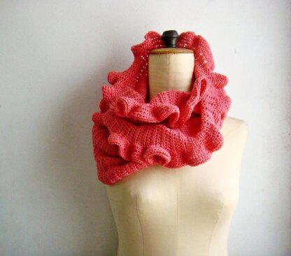 Super easy to make crochet pattern for infinity scarf with ruffled edge. You can wear it at full length as one large loop or two loops to create a cowl. You will need approx. 200g/ 720 yards light worsted weight yarn and hook H (5mm). Difficulty: Easy. Written pattern in PDF format. The pattern is in American terms.