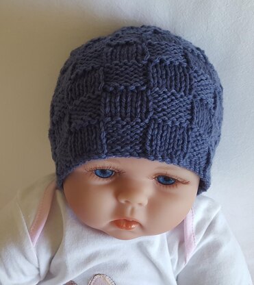 This 8ply Beanie is worked in an easy block stitch. This design will suit either a baby girl or boy.