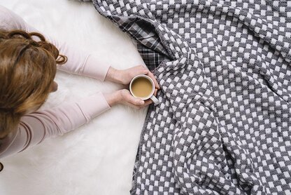 Corinna is knit flat in two colors and finished off with a fabric backside to neatly hide any yarn strands on the wrong side of the work. Complete with an I-cord edges with a clean finish, the end result is a cozy blanket destined to be a classic piece to add to your reading chair. Finished Size: 50" (127 cm) wide by 73.5" (187 cm) long.