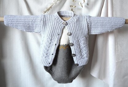 This sweet little set includes the Corliss Cardigan - P163 and Huxley Rompers - P162