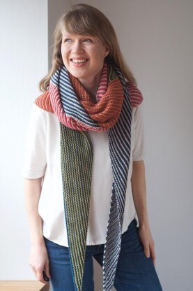Squishy garter stitch is worked in an organic superwash Merino in your four favourite colors. The triangles each use two of them, and each is worked in a different direction for knitting fun and an interesting look. The finished shawl weighs more than 300 g and is 340cm (136inches) wide which makes it extremely versatile – it even replaces your cardigan if you wish. But you can also make a smaller and lighter version using less yarn and the same instructions.