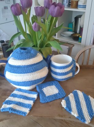 Knitting pattern for matching chair cushion, tea cosy, mug hug and coasters.