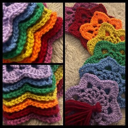 The beauty of the cosmic star pattern is it’s versatility. As well as the purely decorative possibilities, by simply adding chains or tassels you can create wall hangings. By joining the stars it can become a throw or a scarf. The singular motifs can also be used to create coasters or festive tree trims. This pattern is truly cosmic.