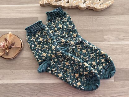 The Cosmus socks are knitted in a toe-up. The toe is knitted in the classic way, increasing on each side, and the ankle is knitted in ribbing. The entire sock is decorated with a starry night pattern knitted in jacquard.