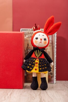 Materials Needed: Yarn A (1 ball/100 grams) --- 5-ply milk cotton, red #15 Yarn B (1 ball/100 grams) --- 5-ply, milk cotton black #21 Yarn C (33 grams) --- 5-ply milk cotton, beige #41 Yarn D (25 grams) --- 4-ply milk cotton, bright yellow #46 1 3d red pearl crown Toy stuffing (50 grams) Scissors Yarn needle Stitch marker Alcohol glue 2.5mm crochet hook Four 10mm flat black eyes with green edges 2mm silver-filled golden beads (2 grams) Six 10mm heart pieces