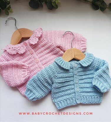 This cute collar cardigan is made from the top down then joining the yarn to make the collar, button band and sleeves, it works up lovely and cosy and has two collar options.