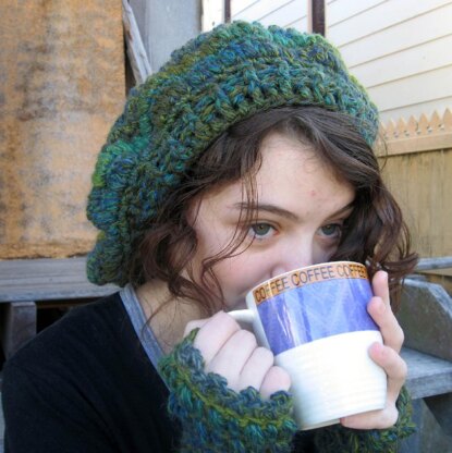 The pattern has both the hat and the fingerless mittens. There are instructions for the mittens to be made short or long.