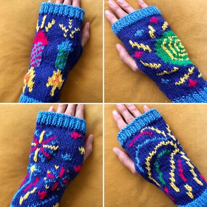 Here is a set of 4 intarsia charts of fireworks with instructions on how to knit them into cosy wrist warmers. You could also make some matching ankle warmers!