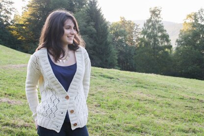 Cosy (me) is knitted from the bottom up, in one piece, with a lace pattern on the fronts. The sleeves are also knitted seamlessly by picking up stitches around the armhole and working short rows to shape the cap.