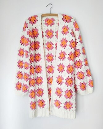 Rock a retro vibe in this classic ‘70s-inspired cardigan. Relaxed and comfortable this cardigan will be a go-to all summer long. Yarn: Paintbox Yarns Simply Aran (100% Acrylic; 201 yards [184 meters]/100 grams): Mandarin Orange 217 (A, 3 (4,4) balls), Bubblegum Pink 250 (B, 3 (4,4) balls), Champagne white 02 (C, 6 (7,7) balls). Sizing: Small (Medium, Large) Finished Bust Size 34 (38, 42)”, negative ease recommended. The different sizes of this cardigan are worked by increasing the hook size to increase the size of each motif. Width across back: 17″ (S); 19″ (M); 21″ (L) Length: 29″ (S); 32″ (M); 35.5″ (L) Armhole: 6.5″ (S); 7.5″ (M); 8.5″ (L) Sleeve Length: 18″ (S); 19.5″ (M); 22″ (L) Shown is size Small.