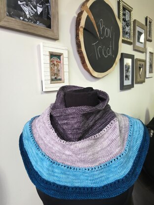 Yarn : Crème de laine Fingering (100% merino), 1 x 115g, 377m / 412 yds. One sizeColor : Crêpe Sarrasin flambée au Curaçao. Gauge : 22 sts x 35 rows = 10 cm (4”) st st. Needles : 4 mm (US 6) circular 60 cm (24”). Other material : 1 stitch marker and 1 tapestry needle to weave ends.