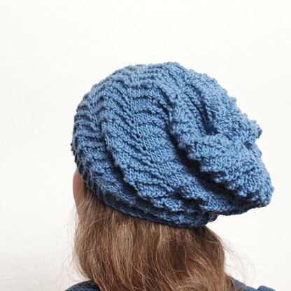 The hat is worked sideways in a textured chevron pattern. At the end, a gathered crown is made.