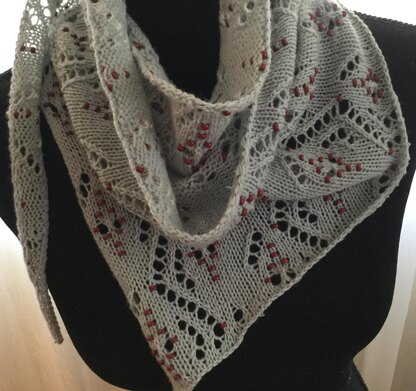 Lovely small elongated triangle shawl or scarf made from YOTH Mother yarn in their subtle Oyster shade. It's a lovely grey with a hint of blue. I chose Chinese red beads to contrast and add a hint of happiness to the flowery lace design.