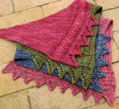 This crescent-shaped shawlette is worked in four sections, each a different color. A combination of faggoting, cable, and points adorn the lower edge of each section; simple garter stitch speeds the knitting and highlights gorgeous yarns. Each subsequent section is connected to the previous section as you go – no sewing!