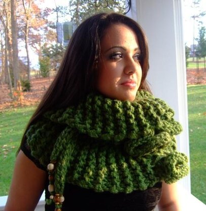 Cowl-A-Bunga has HUGE stitches and has an over sized look. This chunky look is all the rage for fall. It can be worn as a scrunchy cowl, hooded cowl to keep your ears toasty or as a off the shoulder capelet.