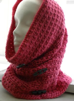 A crocheted cowl /hood with decorative buttons added along the seam. It is worked flat, in a fun textured stitch. It can be worn both as a cowl or a hood. One Size Fits Most 25" circum x 16" long. (to make larger, increase to desired length). Skill Level: Easy. Yarn Weight: Medium Worsted. Crochet Hook: US G