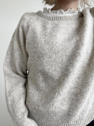 Pattern INCLUDES instructions for four different yarn weights: fingering, dk, worsted and bulky. Garment is knit in one piece from the top down. A shaped neckline is created by knitting back & forth for some rows then remaining front neckline sts are cast on and joined to knit in the round. To finish, neckline sts are picked up, knit in rib and folded over.