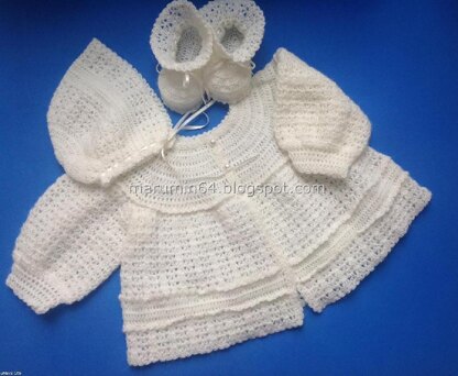 Romantic, vintage look round yoke baby matinee jacket, with full sleeves. The yoke can easily be embellished with embroidery if desired. Three pearl buttons complete the "antique" look of the garment. Matching booties and cap bonnet patterns are available for purchase.