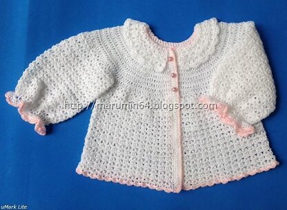 Pretty baby jacket worked with very fine baby yarn or cotton thread and a 2.5mm hook. The bodice is worked from the yoke down in one piece. The scalloped collar (which is optional) is very simple to make and is worked at the end.