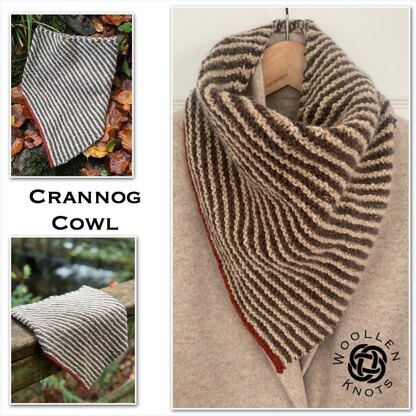 Crannog Cowl is an asymmetric triangular-shape. It’s knit flat, starting with a provisional cast on and worked in garter stripes, then joined to the cast on stitches using a three-needle bind off. The remainder of the stitches are cast off using an i-cord bind off in a contrasting colour. If you do not wish to use the provisional cast on/three needle bind off, instructions are given for working the cowl without. The size of the cowl can easily be made bigger and directions for this are included.