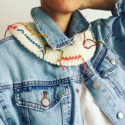 CRAYON collar is made on flat needles, bottom up, using different size needles, 6 mm, 5 mm, and 4 mm. Changing needle size will make the collar go round naturally. A crochet cord is made on the edges to tie up closed. Make it plain or with duplicate stitch (link to video). See other pieces from CRAYON collection.