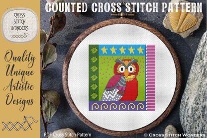 A wonderful Crazy Patch Owl counted cross stitch design.\nGreat stitched individually or partnered with the other 11 Crazy Patch Owls!\nExclusive licensed artwork by Clipartopolis.\nCross Stitch by Marcia Manning.\nDesign is 66 x 66 stitches in size.\nPDF is a COLOR counted cross stitch chart which lists suggested DMC floss colors, and includes a color picture.\nStitched design size is as follows:\nSize 11 count: 6.00 x 6.00 inches or 15.24 x 15.24 cm\nSize 14 count: 4.71 x 4.71 inches or 11.97 x 11.97 cm\nSize 16 count: 4.13 x 4.13 inches or 10.48 x 10.48 cm\nSize 18 count: 3.67 x 3.67 inches or 9.31 x 9.31 cm\nSize 22 count: 3.00 x 3.00 inches or 7.62 x 7.62 cm