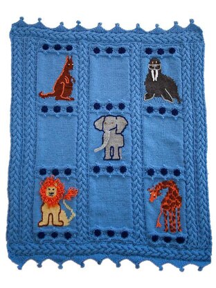 Friendly animals adorn this cozy blanket and keepsake for a baby or small child. Each animal has a special feature. The kangaroo has a pocket, the elephant and giraffe have swinging tails, and the elephant has a swinging trunk.