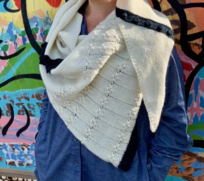 A biased shaped shawl is knit with 2 colors, worsted weight yarn with some bobbles and wrapped stitches.