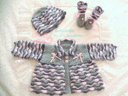 15-16” or 37.5-40cm Height (Approx 2.5-4lb Prem) Size 100g 4ply yarn in colour A, 100g in colour B and 100g in colour C, 3 buttons, 2m ribbon for bootees and bonnet, embellishments of your choice, 3 stitch holders, 1 x 2.75mm crochet hook, 1 x 3.25mm hook for the bootees only, 1 x pr 2.75mm needles making a tension of 30sts and 38 rows to 10cm square over stocking stitch.