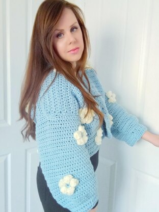 Crochet this beautiful, feminine and cool cardigan with the help of this easy pattern. This very easy to follow pattern can be crocheted by beginners and experts alike. It is a slightly cropped cardigan featuring puff flowers, and the cardigan can be made longer very easily (full instructions in the pattern).