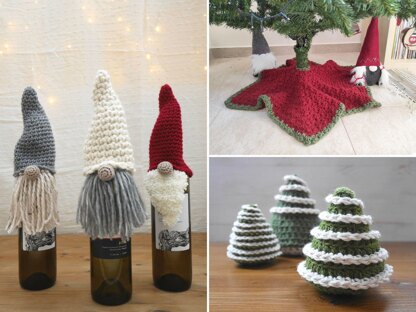 This is a collection of 3 crochet Christmas patterns, made in a beautiful pdf ebook. It includes one Christmas tree skirt pattern, mini crochet Christmas trees, and a gnome wine bottle cover pattern.