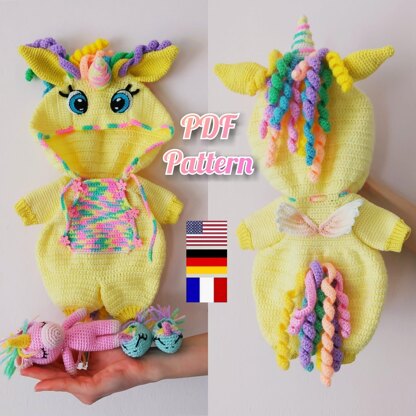 Dieses Häkelmuster enthält eine detaillierte Beschreibung, wie man Kleidung für Puppen in Einhornoverall, Stiefeln und Amigurumi-Einhornspielzeug mit vielen Schritt-für-Schritt-Fotos herstellt.